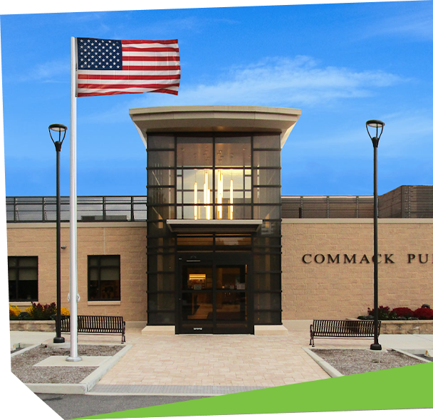 The Library is located at 18 Hauppauge Road in Commack, New York (11725). If you are coming from the west, take the Long Island Expressway to exit 52 Commack Road. Go North on Commack Road for approximately one mile and make a left on Hauppauge Road. The Library is located on the corner of Commack Road and Hauppauge Road.