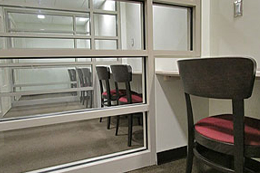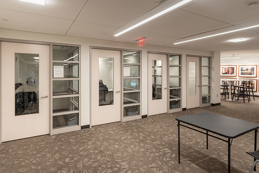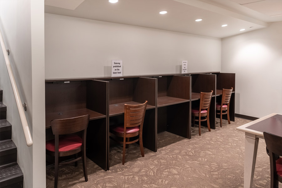 The Library’s lower level is designated for quiet study. This level features two and four-person tables, as well a four single-occupancy study rooms and one group study room. Individual study rooms are available on a first come, first served basis. Stop by the Reference Desk to access the group study room.